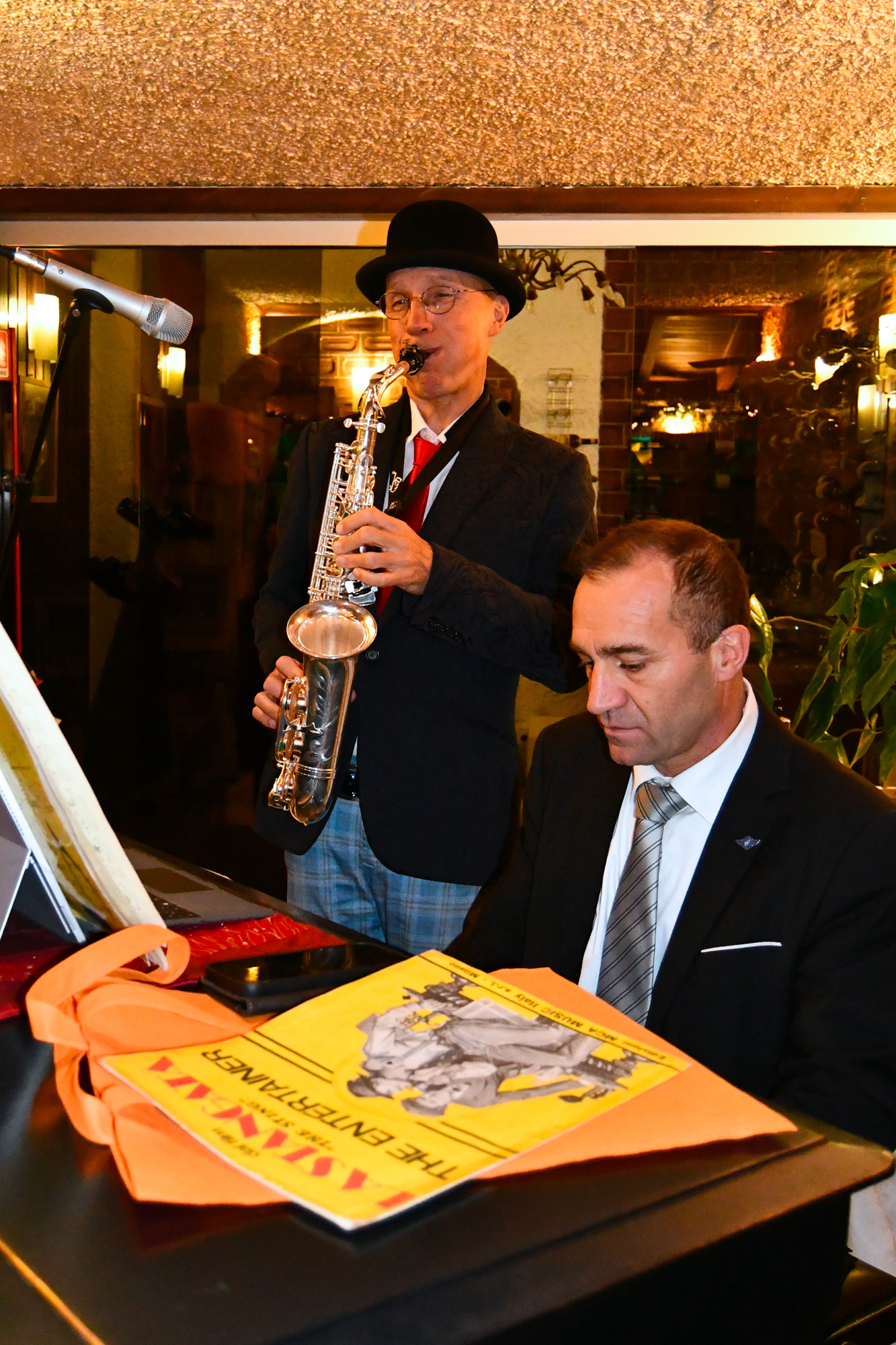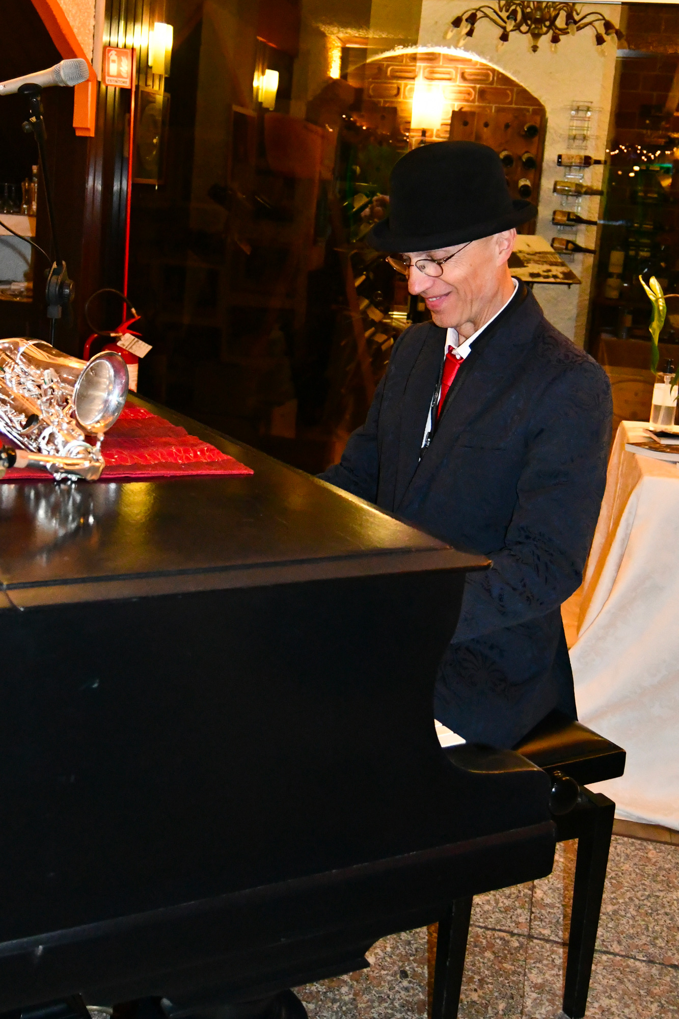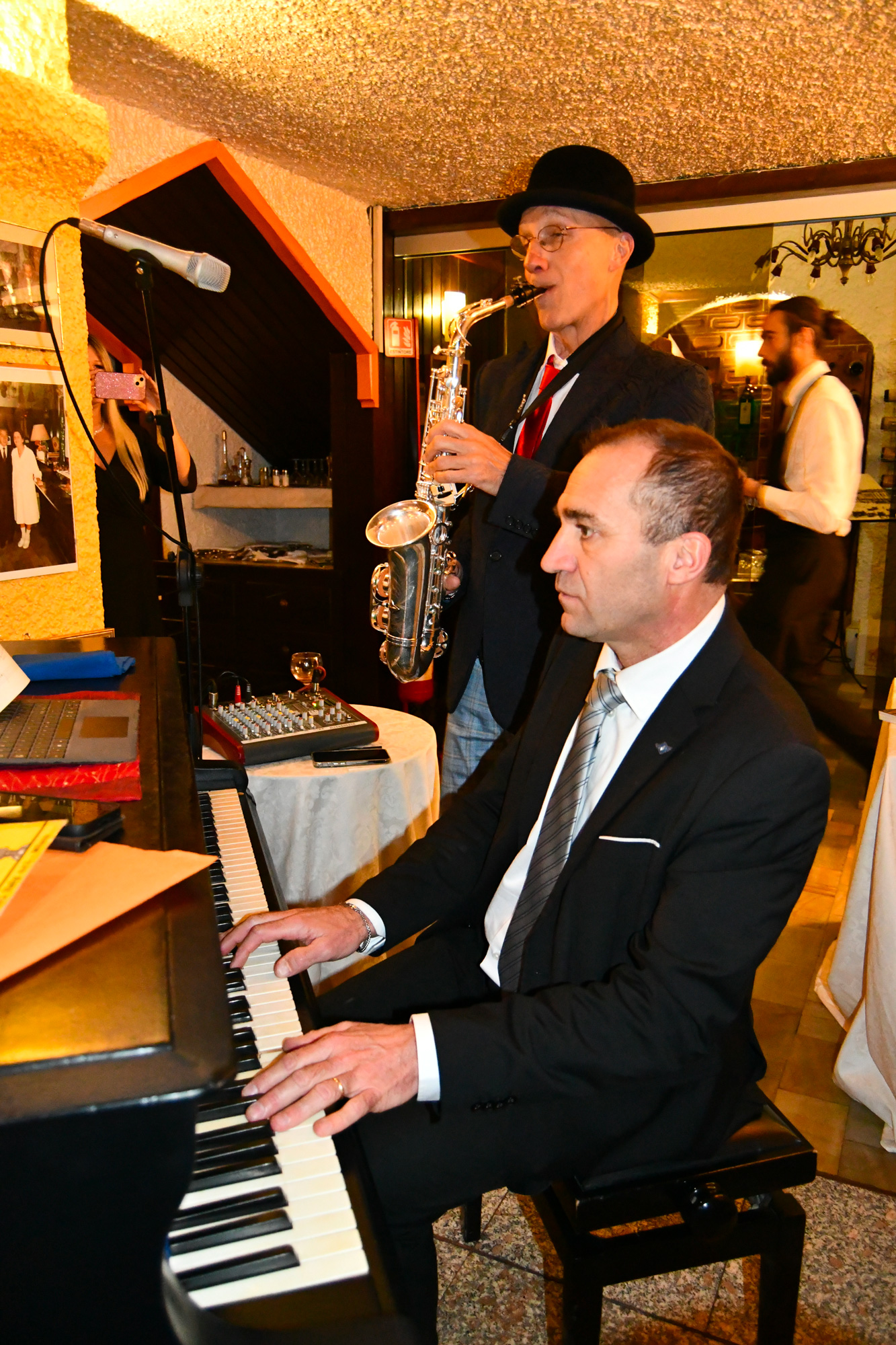 La cena è stata accompagnata da un piacevolissimo sottofondo musicale su pianoforte o sax, ad opera del – nostro ormai – Giorgio Porfirio, ed ulteriormente allietata da un duetto che ha visto il Presidente esibirsi al pianoforte sempre con il nostro Giorgio, questa volta al sax, in una versione apprezzatissima di “Night & Day” di Cole Porter.