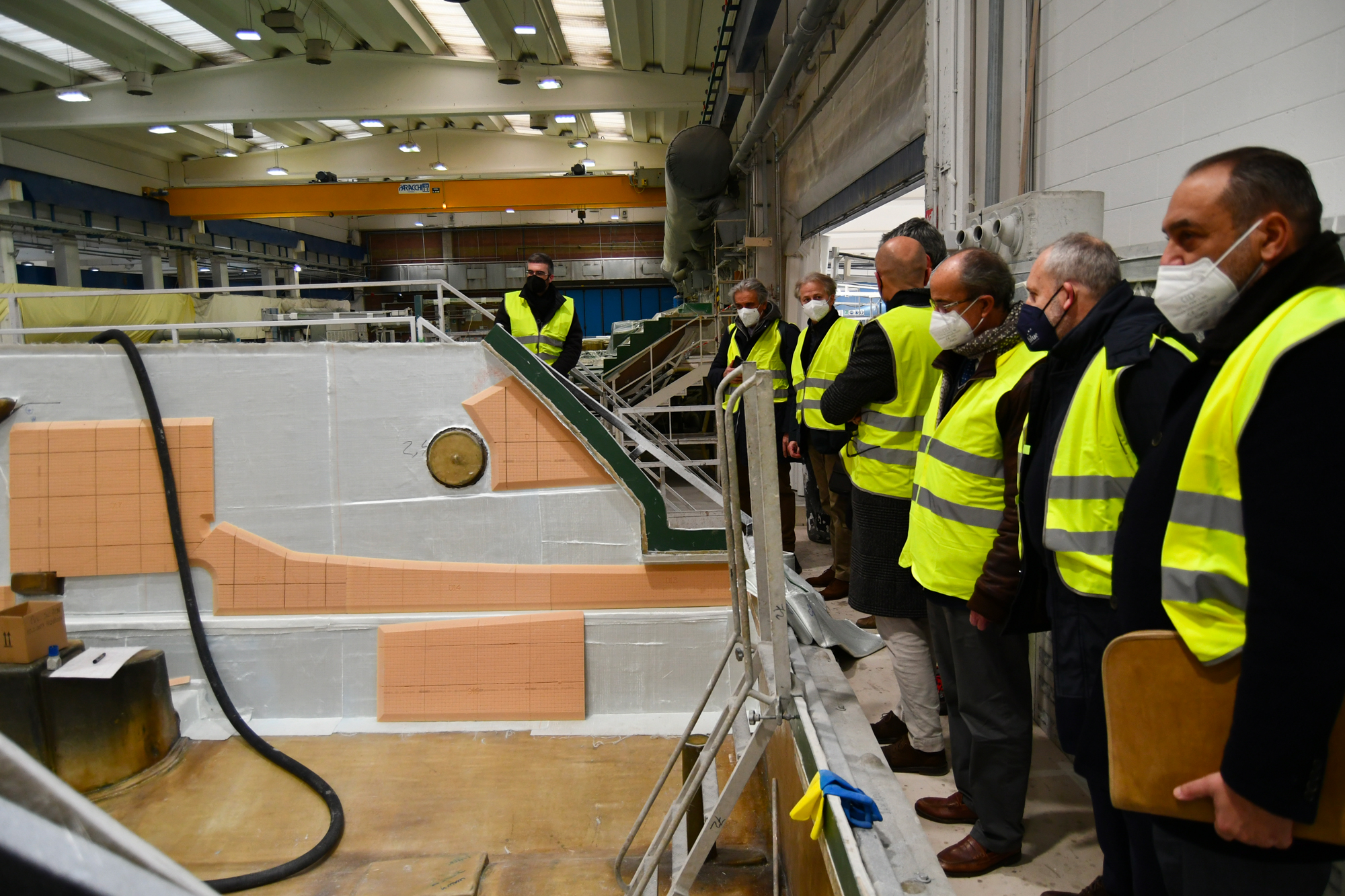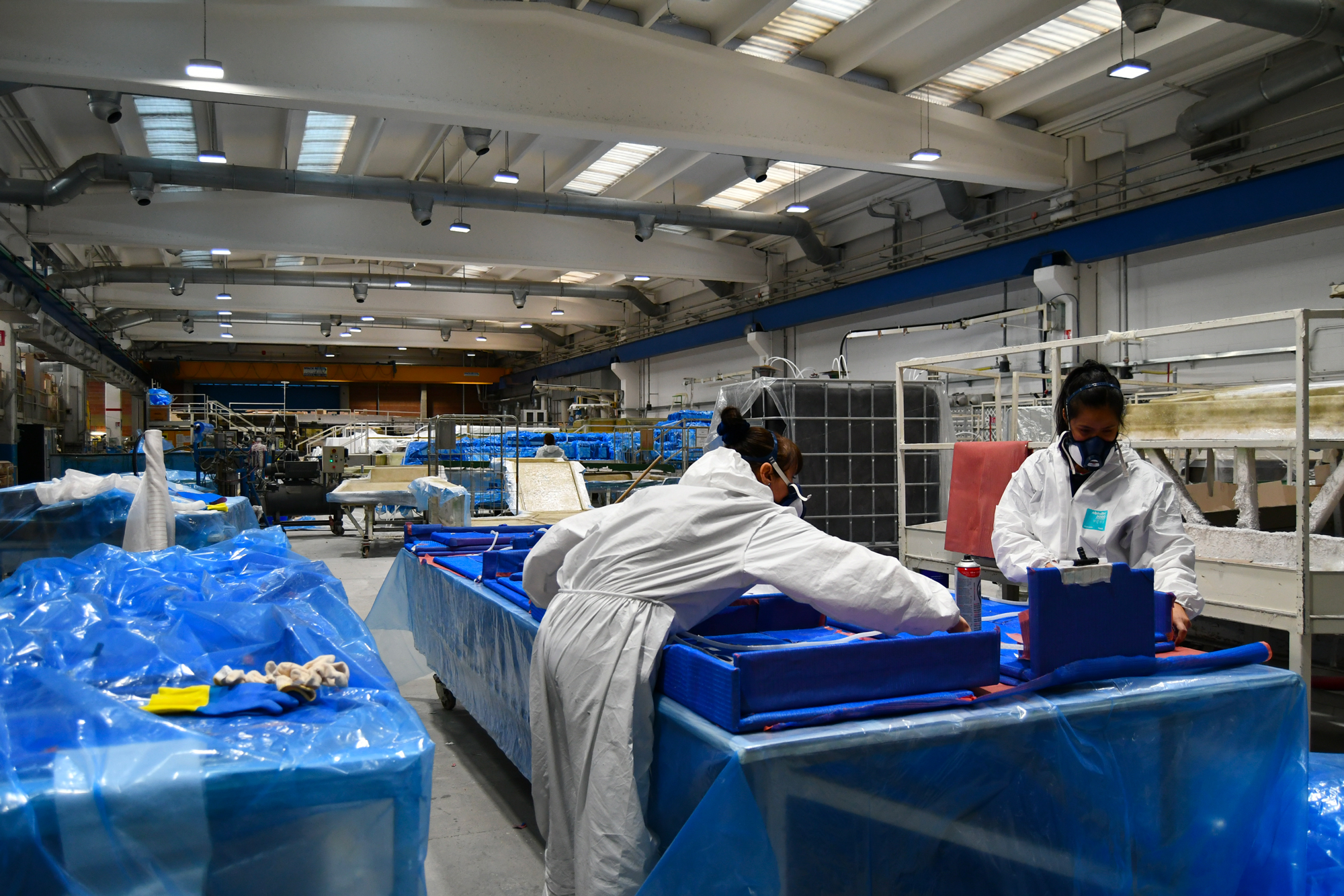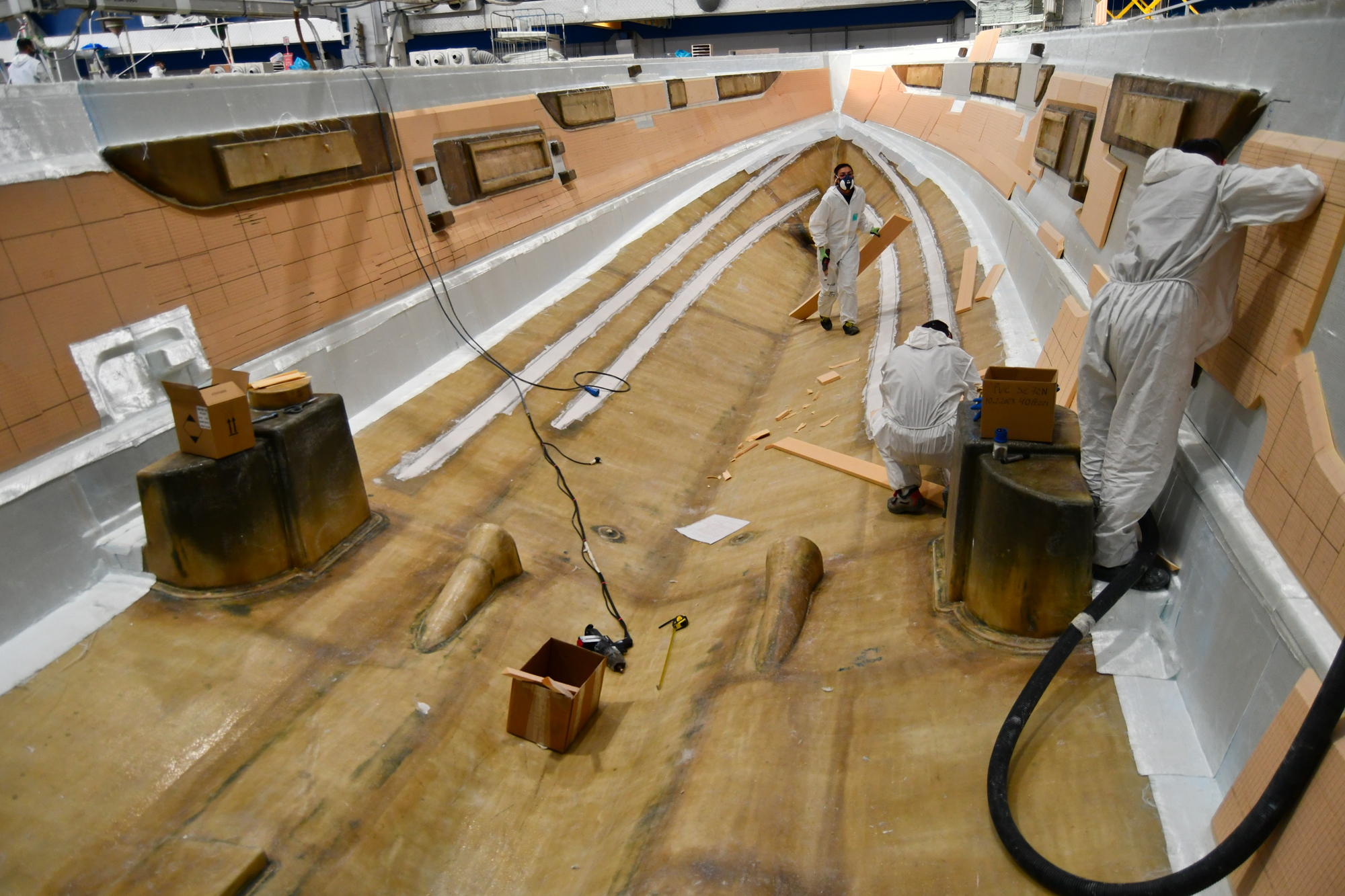 Infatti a fianco dei due reparti per la vetroresina, processo che molto genericamente consiste nell’impregnare di resina poliestere termoindurente una stuoia di fibra di vetro o un materassino anch’esso in fibra di vetro (in gergo mat), ci sono ben 3 reparti di allestimento per l’integrazione di quanto suddetto ed una piscina per le prove.