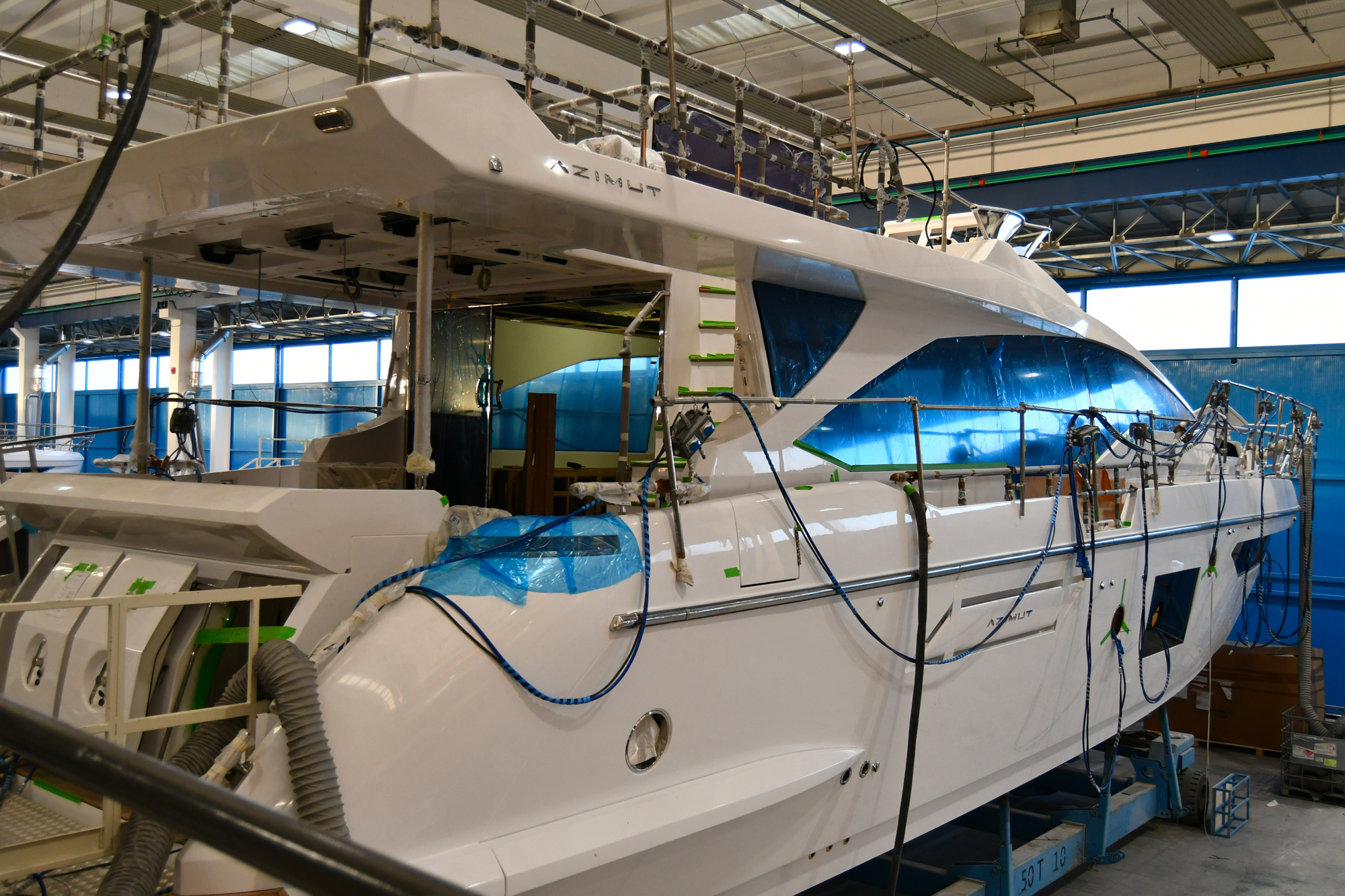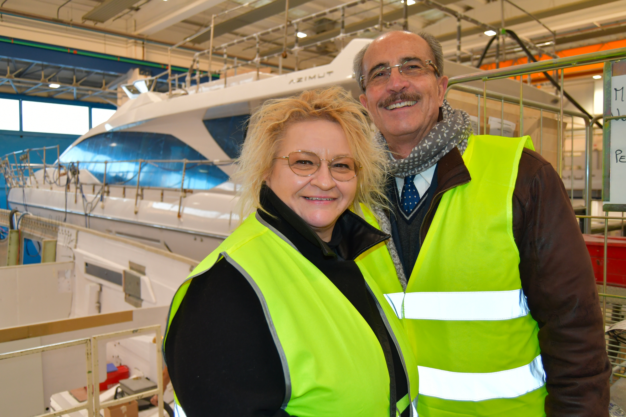 Proprio nella nostra visita abbiamo potuto constatare il contenuto di questo successo: Azimut è leader mondiale nella costruzione di scafi in vetroresina da 10 a 44m e con l’acquisizione di Benetti, avvenuta nel 1982, ha espanso la propria gamma anche agli scafi in acciaio di dimensioni superiori fino a 120m.