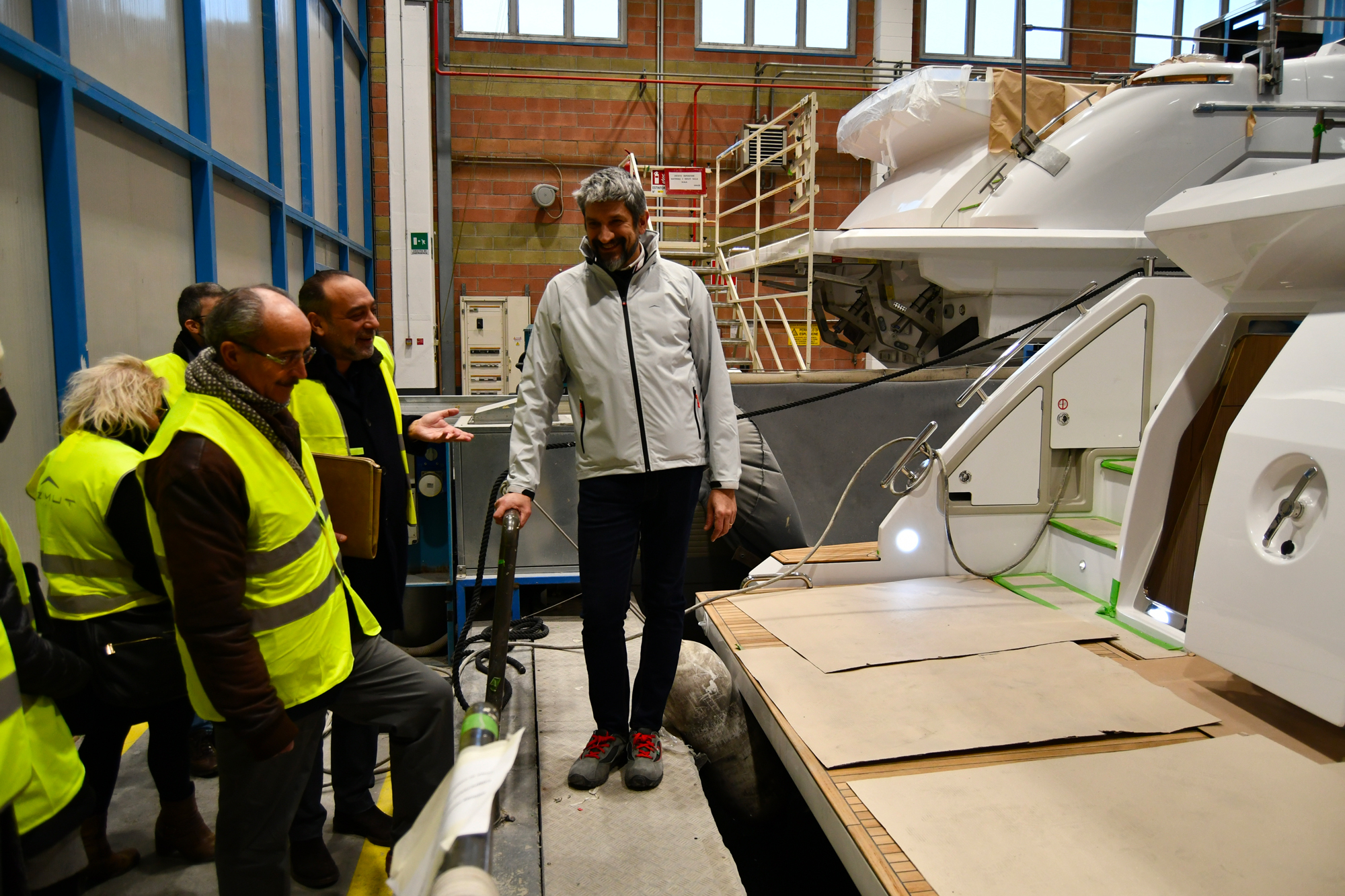 Il gruppo ha nel suo catalogo ben 34 modelli che fuoriescono da 12 linee di produzione, con una vita media per modello di circa 4-5 anni ed una frequenza d’uscita di 3/6 modelli all’anno. Sono proprio le linee di produzione di Avigliana che abbiamo potuto visitare quel venerdì costatando come da un semplice guscio, sotto le abili mani degli operatori che stendono la fibra di vetro impregnandola di resina, che l’imbarcazione prende la forma voluta dal suo ideatore/progettista che trasforma in realtà i sogni di quel mondo del luxury che tutti noi, almeno una volta, abbiamo ammirato o avvicinato percorrendo le banchine di un porto per yachts.