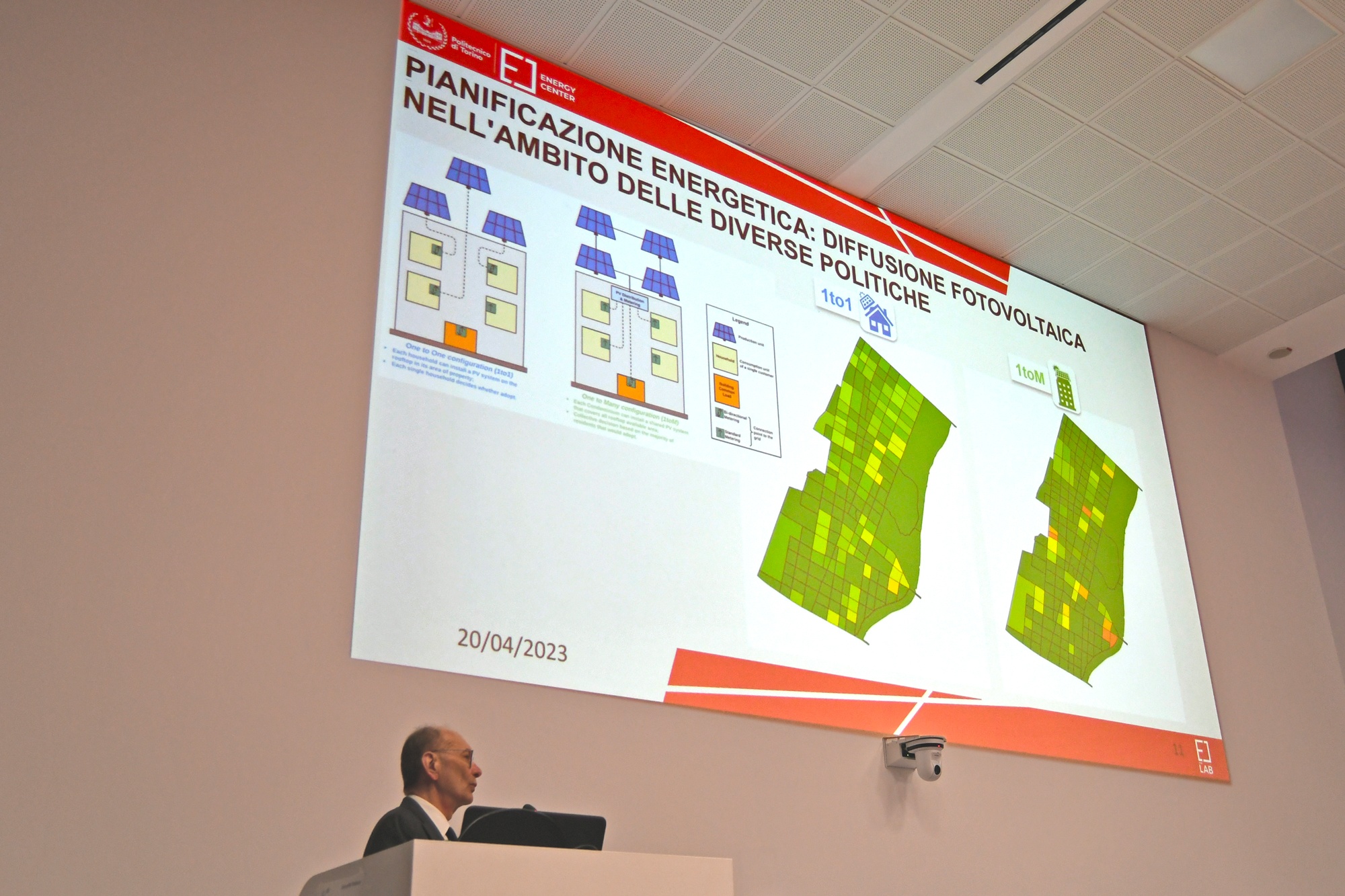 Il primo relatore Prof. Romano Borchiellini, Referente del Rettore per l’Energy Center e Coordinatore del centro Interdipartimentale Ec-L Energy center Lab, ha presentato l’Energy Center del Politecnico di Torino, centro non solo di attività formative, ma anche di laboratori di ricerca, di sedi distaccate di primarie aziende del settore, e di aziende spin-off. L’Energy Center è un modello di cooperazione tra pubblico e privato, non solo per gli aspetti scientifici, ma anche per gli aspetti organizzativi ed amministrativi: un esempio è la gestione delle problematiche di sicurezza. La ricerca si esplica attraverso i seguenti filoni principali: i sistemi multi-energia, pianificazione energetica, accumulo di energia elettrica, idrogeno, biometano, piani energetici per paesi in via di sviluppo, sicurezza di sistemi energetici e comunità energetiche. In particolare, i sistemi multienergetici si inseriscono prepotentemente come protagonisti dei futuri agglomerati urbani (Smart Cities), e rendono sempre più importante l’esigenza di pianificazione e di simulazione attraverso modelli matematici di variazioni rilevanti di scenario, quali l’introduzione dell’auto elettrica e la relativa necessità di impianti distribuiti di erogazione. Le comunità energetiche possono essere una risposta fattiva alle esigenze future, e sono attivate dalle comunità locali, dalle aziende e dai relativi centri di competenza. Le comunità energetiche fanno sentire il singolo e le comunità protagoniste della transizione energetica, aumentando la consapevolezza dell’importanza dell’energia, come bene da sviluppare, non solo da consumare.