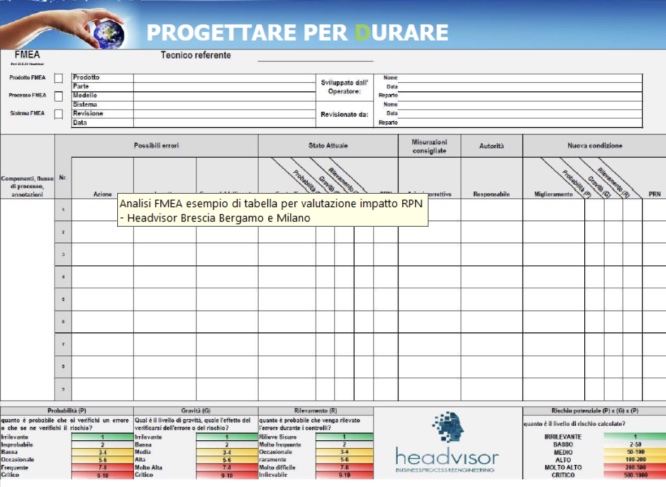 Nell’approccio DRERR prima citato, per assicurare la Durabilità dei prodotti è fondamentale l’utilizzo della tecnica FMEA – Failure Mode & Effect Analysis (peraltro già obbligatoria da decenni nel settore Automotive) che estende l’analisi del rischio di malfunzionamenti all’intera vita utile di un prodotto migliorandone sia l’affidabilità, ossia l’inverso del tasso di guasto, che la manutenibilità, soprattutto quella predittiva in quanto permette di ridurre l’impatto ambientale riducendola agli interventi strettamente necessari e di prolungare la vita utile del prodotto in funzione del fatto che viene fatta prima che si verifichino guasti eventualmente non riparabili.