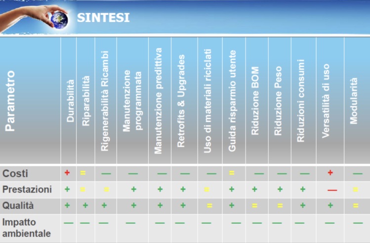 In sintesi, tutti gli elementi passati in rassegna, dalla Durabilità alla Modularità hanno, come si può vedere dalla tabella sottostante un impatto sostanzialmente positivo sui classici parametri Costi, Prestazioni, Qualità e fortemente positivo sull’Impatto Ambientale aggiungendo alle caratteristiche di inevitabilità e ineluttabilità dello sviluppo sostenibile citate all’inizio anche quella di un non trascurabile miglioramento dei parametri sopra citati.