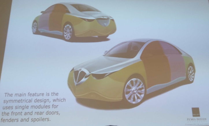 A conclusione dell’intervento, di particolare interesse tecnico, è stato rievocato il progetto della LANCIA J fatto nel 2006 (!) dal designer Enrico Fumia con soluzioni estetico-funzionali che per molti aspetti prefigurano la modularità dei componenti, ad esempio il fronte-retro, importante elemento di un progetto sostenibile.