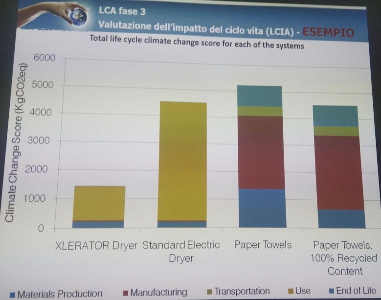 A titolo di esempio si riporta di seguito il risultato di una LCIA fatta sui sistemi asciugatura dell’esempio prima citato nel quale l’altezza delle barre indica l’impatto ambientale complessivo e i vari colori l’influenza delle 5 categorie in cui si sono suddivisi i fattori di influenza riportati in basso nella slide